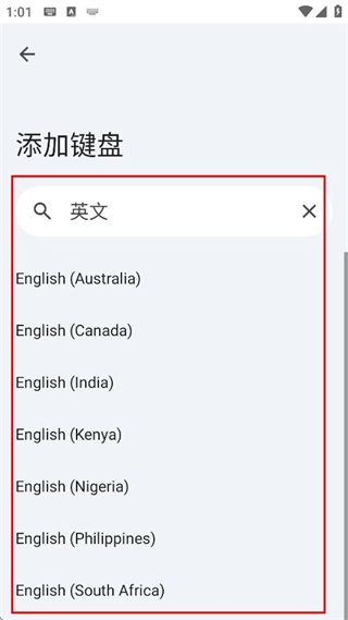 在搜索框里输入英文,就能看到相关的英文键盘选项,选好后就能添加英文键盘了。