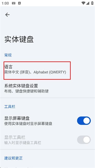 在实体键盘的设置界面中,选择“语言”选项,即可进入语言设置页面。