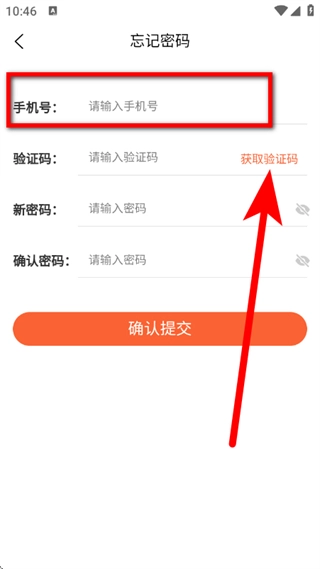 3、在忘记密码页面,输入手机号,点击获取验证码。