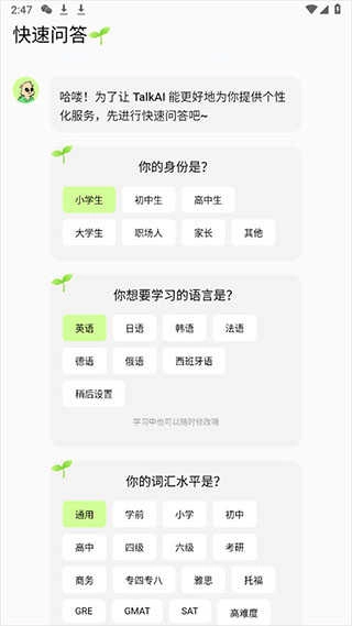 1、先打开TalkAI练口语应用,接着选择个人的身份信息和词汇水平