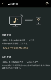 2、用一台设备打开此页面,在另一台设备的歌曲列表中点击多功能按钮,选择发送到WiFi传歌就可以了。(在WiFi传歌界面的右上角,有设置按钮,通过它能自行选择歌曲的保存路径。)