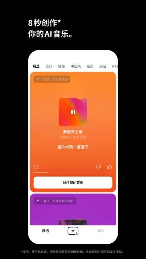 丰富的自定义功能,让你能随心挑选曲风、心情与音色,打造出专属于自己的个性化音乐。