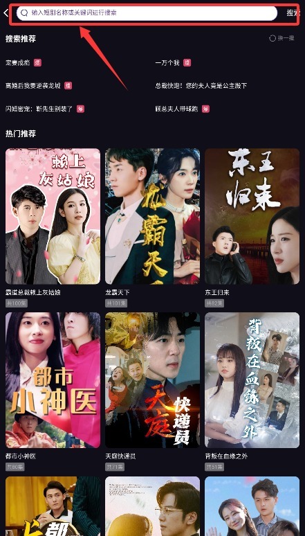 2. 在首页查看分类展示的各类短剧资源,点击顶部搜索栏,即可进入短剧查询页面。