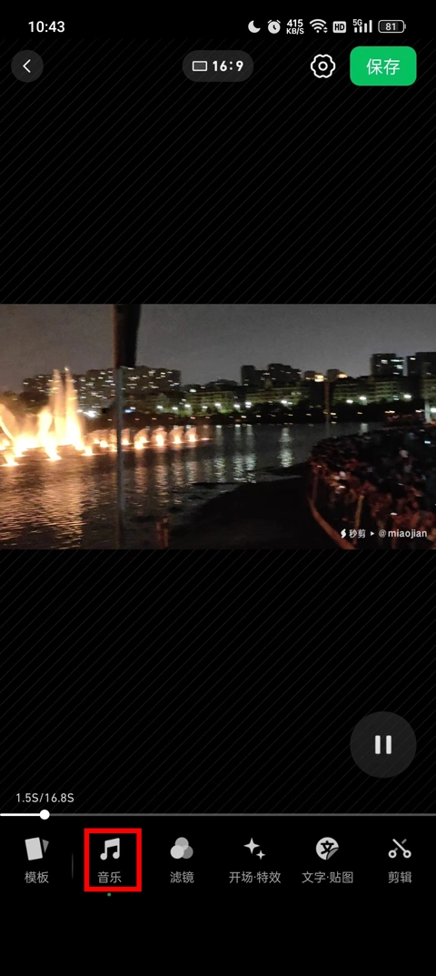 1、添加视频进入到编辑页面之后,选择下方的音乐。