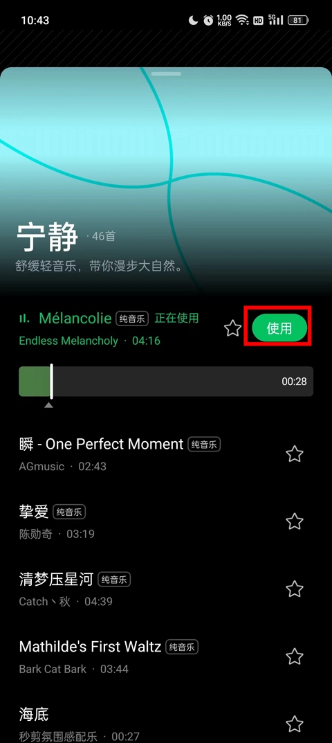 3、根据自己的视频的类型进行添加音乐的类型,选择之后点击使用即可。