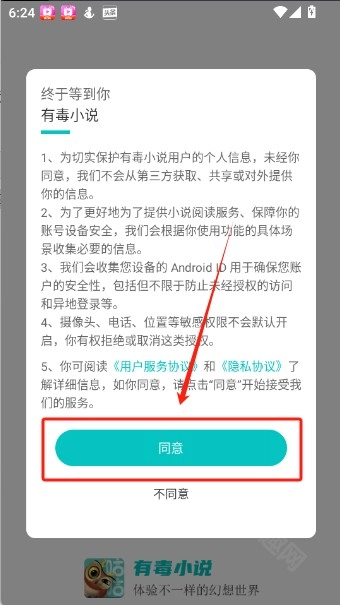 1、打开有毒小说,点击“同意”