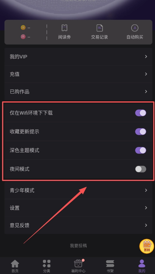 1、登录与设置,完成账号登录操作后,在“我的”页面中,可根据自身需求开启深色模式或青少年模式。