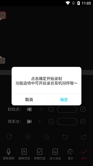 录音结束后会自动跳转至剪辑界面,若对某段录音不满意,可在该界面选择需剪辑的音频时段——既能够通过左右拖动来选定,也可以在编辑框中直接输入剪辑的开始与结束时间;待时间参数确认无误后,点击剪辑页面的保存按钮,就能获取符合需求的那段录音音频了。