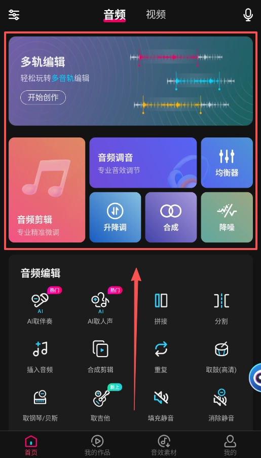 1、登录账号后,从首页进入“多轨编辑”界面,在进行基础剪辑操作之外,也可以尝试探索“AI取伴奏”“AI取人声”等高级功能。