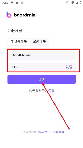 3、进入【boardmix】的注册页面,先选择【手机注册】选项,接着填写对应的手机号并输入验证码,最后点击【注册】按钮,即可完成账号的创建。