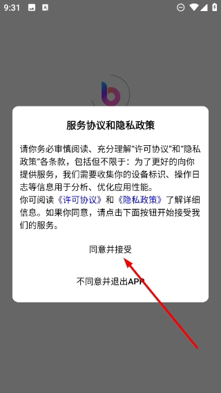 1、打开应用后,需阅读《服务协议和隐私政策》,点击“同意并接受”按钮,才能继续使用应用服务。