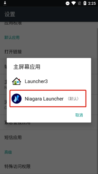 除此之外,在系统设置的“主屏幕应用”选项里,我们还得把它切换为“niagara launcher”