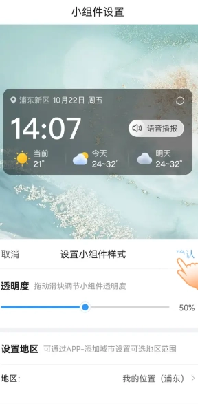 4、对小组件的透明度和地区进行设置后,点击【确认】按钮以保存相关设置。