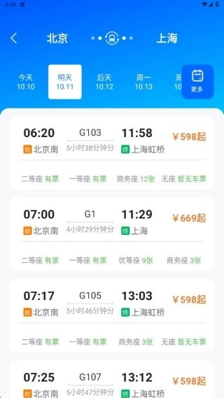 4、点击火车票查询功能就能得到结果,页面会呈现当日所有车次的票价,同时也会展示余票数据。