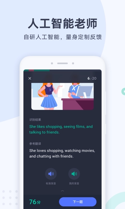 AI实时发音纠正功能:在跟读句子之后,AI系统会对发音进行评分,并且明确指出哪些单词的发音不够标准,哪怕是像th咬舌音这样细微的发音要点也能精准识别。