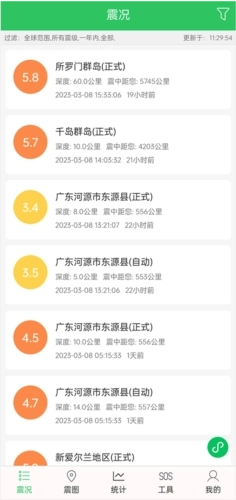 以列表与地图相结合的方式呈现全球最新的地震信息,支持对地震的发生范围、时间以及震级进行筛选。