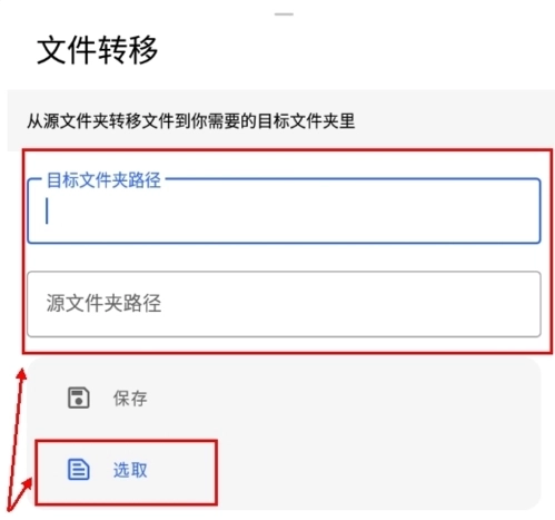 5、然后在这两个栏里分别将转移文件和想要转移到的位置选入即可。