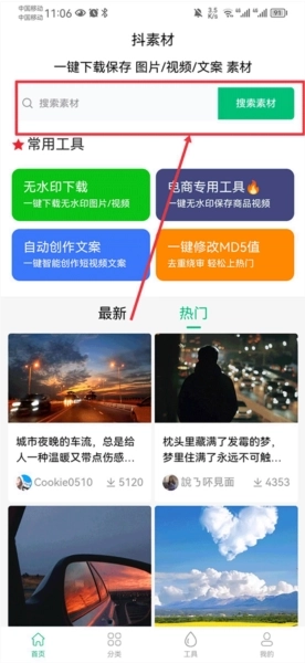 1、启动抖素材短视频素材软件,可在首页搜索框输入目标素材关键词进行查询,也能进入分类界面,根据不同素材类型进行筛选选择。