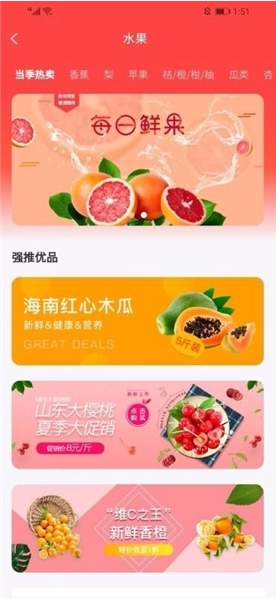 1、应用内涵盖丰富的生鲜水果、服饰鞋帽、美妆个护等品类商品,支持用户在线挑选购买;