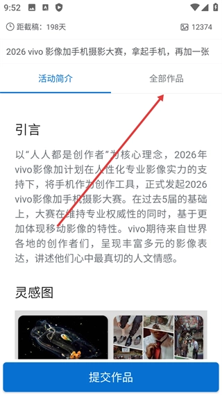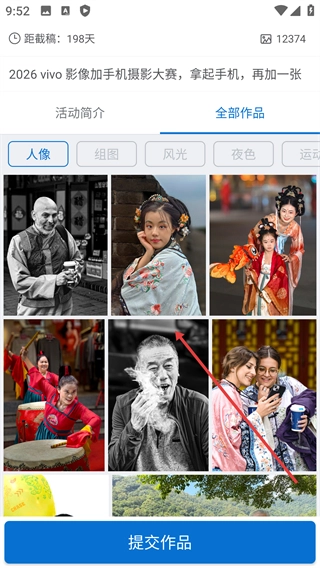 在全部作品板块里,你能浏览人像、组图等各类参赛作品,还可以点击“提交作品”按钮来参与大赛。