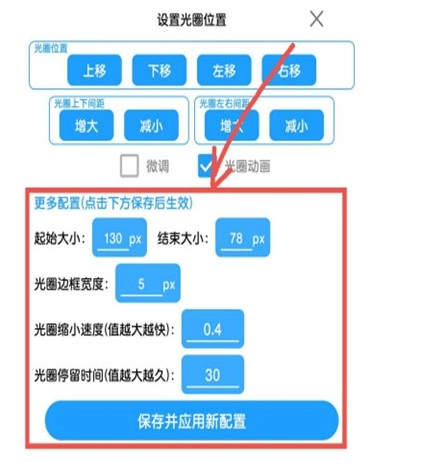 使用第一排按钮来调整光圈的位置,第二排按钮用于调节间距并先移动到大致位置,开启左下角的微调选项即可进行微调操作。