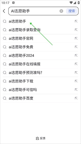 1、打开百度App,在搜索框中直接输入“AI志愿助手”,接着在弹出的下拉选项列表里点击【AI志愿助手】选项即可。