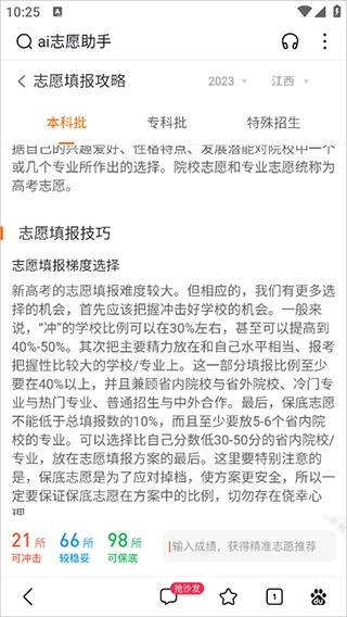 3、借助智能算法,参考院校过往的录取分数情况,为用户推荐录取概率较大的院校,同时配备专业的专家分析服务。
