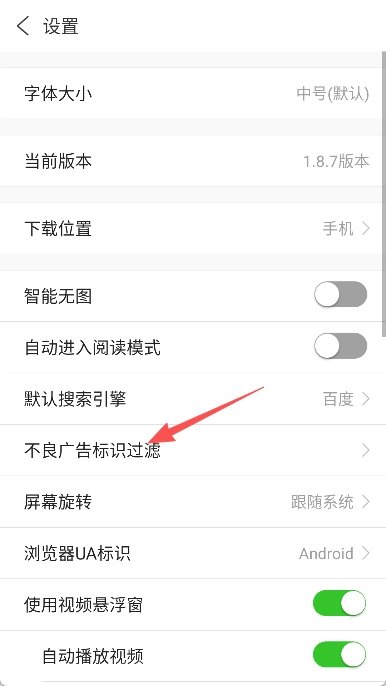 4、点击“不良广告标识过滤”选项,开启过滤功能。