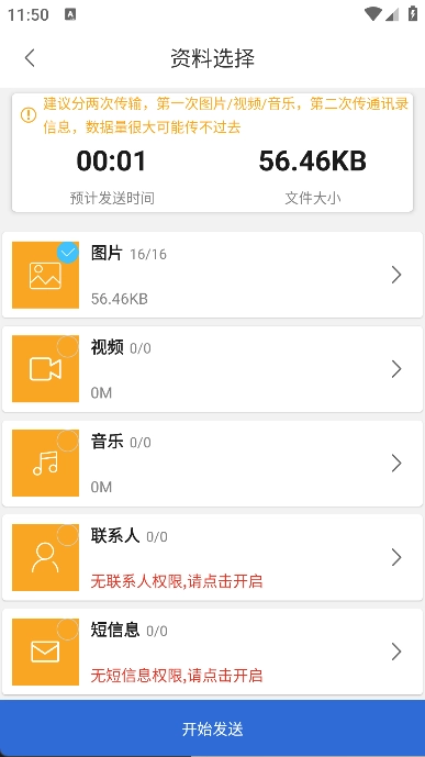 4、选择需要传输的资料类型,如通讯录、照片、视频等。