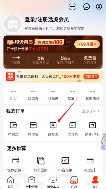 2. 在“我的订单”中点击“待安装”,找到保养套餐。