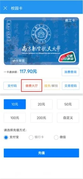在微信中找到企业微信“南京航空航天大学智慧门户”,选择“校园一卡通”,可以选择微信充值。充值完成可直接用于校内消费。