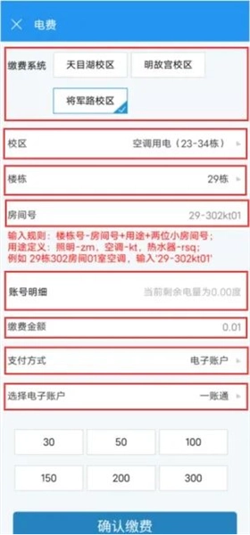 4、填写对应信息:校区、楼栋、房间号、金额,如下图: