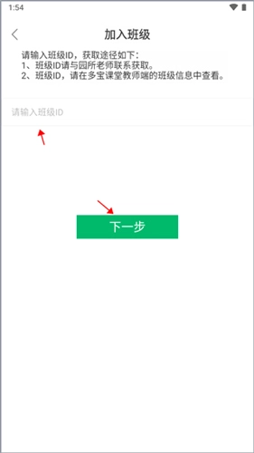 3、找园所老师获取班级ID,输入进去最后点击下一步,等待园所老师审核通过后就加入好了,这样就能使用这些功能了。