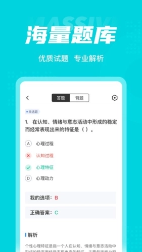 心理咨询师考试聚题库提供丰富的历年真题和全真模拟,专业团队打造权威解析。用户可以随时随地离线试卷,不受网络限制。应用还提供个人专属题库错题集功能,记录用户所有做错题目并收藏重要题目,有助于巩固知识点。