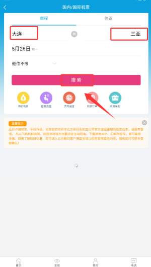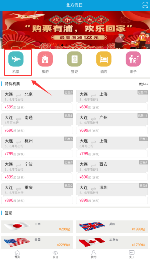 1、打开北方假日应用后,在首页的导航栏里找到并点击“机票”选项,进入航班查询界面。