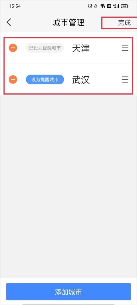 3、城市添加成功后,若需进行排序、删除等操作,可点击右上角的“编辑”按钮进行设置,设置完成后就能查看天气信息。