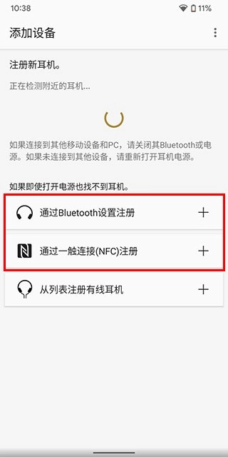 2、若此时打开电源软件无法检测到耳机,我们可选择通过蓝牙设置进行注册,或是利用下方的一触连接功能(需手机支持NFC)来手动连接耳机。