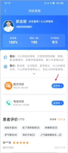 3、进入医生的个人简介页面后,可看到有两种问诊方式,从中选择一种即可。