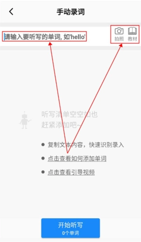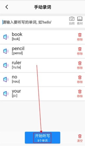 之后用户可以选择搜索、拍照、教材或文本复制这几种方式来录入单词(小编选用的是教材录入方式)。