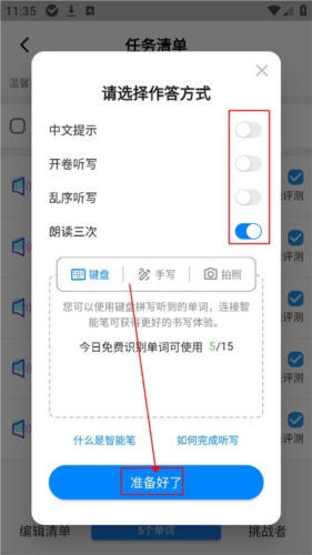用户接下来需要先选好作答方式,可从键盘、手写、拍照三种里挑选;同时在上方区域,还能对中文提示、开卷听写、乱序听写、朗读三次这几个模块进行勾选操作。