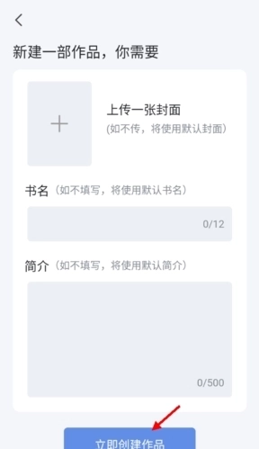 2、挑选好一张封面图片后,填写对应的小说各项内容,点击创作按钮,就意味着正式开启发表写作流程了。