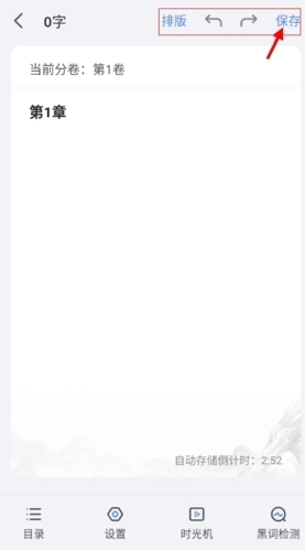1、在撰写小说的页面右上角,用户轻点“保存”按钮即可防止内容丢失;而排版功能能够补齐文章里的空缺位置、调整文字对齐等,让小说整体呈现更美观的效果。