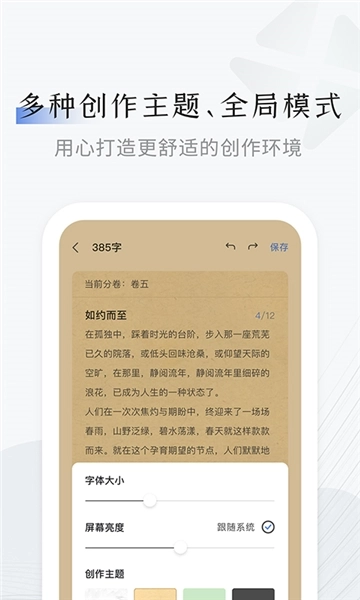 2、支持自定义设置创作主题,同时还能对屏幕亮度、字体大小等参数进行调节。