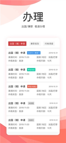【网上办理】:出国(境)申请、兼职报告、问卷调查。使线下事务办理通过线上办理即可实现,满足多种事项的申请和办理工作,极大地满足了老干部的办事需求,同时有效提升了工作效率。