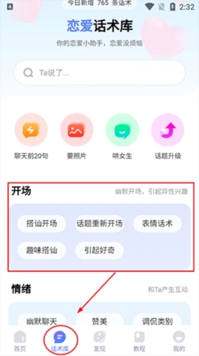 3、要是想和心仪的对象开启聊天,还能在【话术库】里点击【开场】,让你们的聊天既幽默有趣,又不会尴尬!