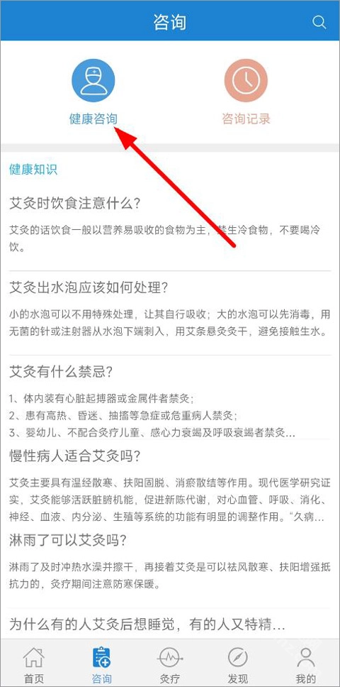 1、打开艾灸养生,进入首页最下方点击咨询进入咨询页面