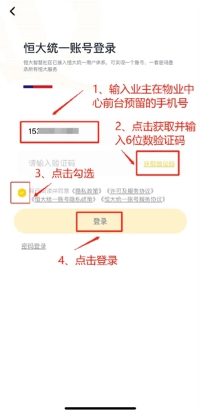 步骤3业主本人使用其在物业中心前台预留的手机号码进行注册登录