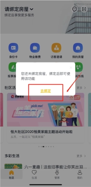 1、最新版的恒大智慧社区,登陆软件后,在首页即可找到“物业缴费”的窗口