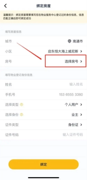 步骤7输入“姓名”-“选择身份”中选择对应的“业主”/“家人”-输入“身份证号”点击绑定按钮。