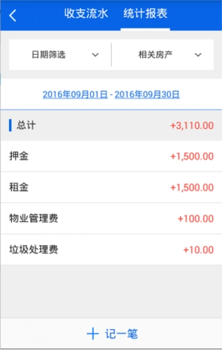 可以统计某项费用(比如租金)的总金额,还能按照时间段、费用类型、房产来进行查询。操作路径是“我的账本”>“统计报表”。如下图所示: